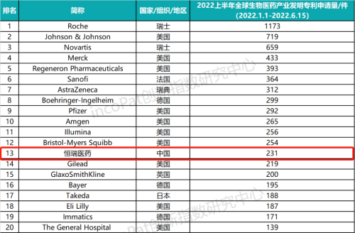 近日,全球专利数据库incoPat创新指数研究中心发布全球生物医药发明专利TOP100榜单,九游会ag医药以上半年231件发明专利申请量位列榜单第13名,是唯一一家进入TOP20的中国药企。