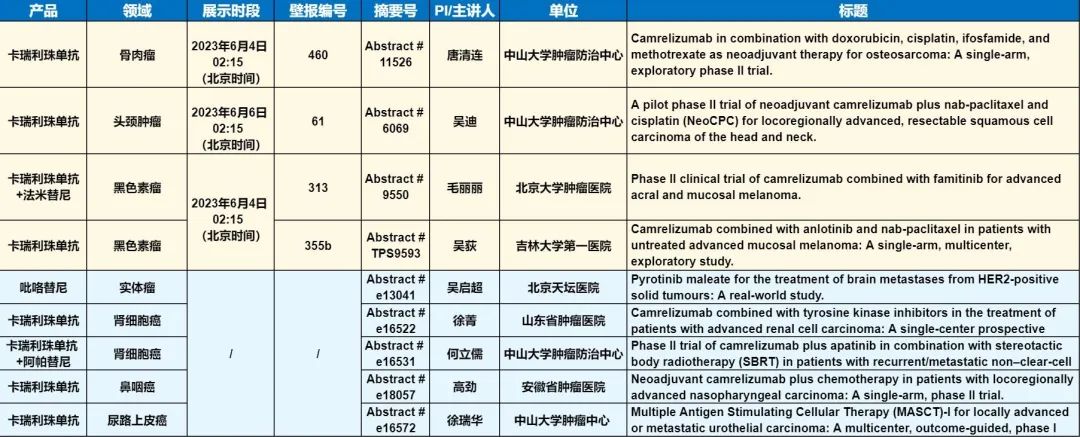此外,在头颈肿瘤、黑色素瘤、骨肉瘤、鼻咽癌、肾细胞癌、尿路上皮癌等多个领域,卡瑞利珠单抗、吡咯替尼等产品相关研究一共入选了4项壁报展示和5项线上发表,彰显了九游会ag医药强大的自主研发综合实力。